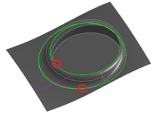 他の加工と同様に加工面を選択します。実際の加工範囲は軌道線と輪郭線で囲