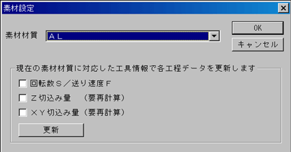 「現在の素材情報に対応した工具情報で各工程データを更新します」の必要項目に