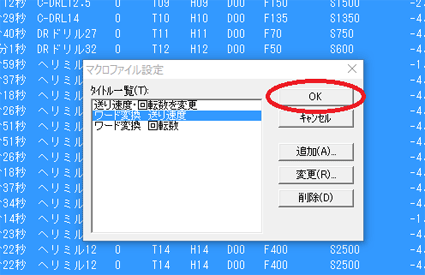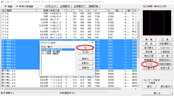 1)変更したい工程を選択し加工工程リストのマクロボタンをクリックします