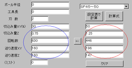 青い○印の左側が実際に使用するデータです。赤い○印の右側は求めた切削条件の